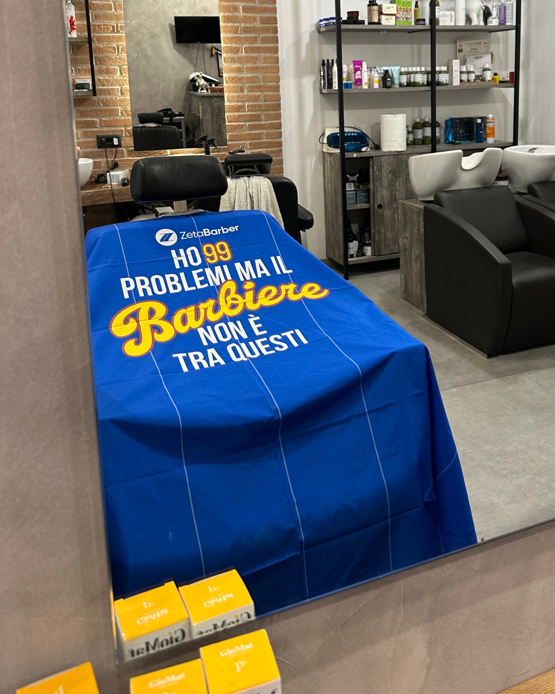 Mantellina professionale da barbiere in materiale idrorepellente, studiata per offrire massima protezione e comfort ai clienti durante taglio e barba. Con dimensioni generose e una stampa laser di qualità, unisce praticità e stile per il tuo salone.
